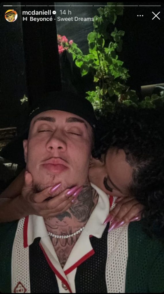 Na imagem, o funkeiro aparece recebendo um beijo da morena, ao som da canção sweet dreams, da cantora Beyoncé, que diz: “Você pode ser um sonho doce, ou um lindo pesadelo. De qualquer jeito eu não quero acordar de você. Doce sonho, ou um lindo pesadelo. Alguém me belisque. Seu amor é muito bom pra ser verdade”.