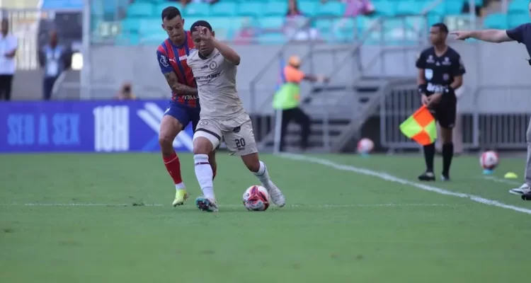 Bahia empata com o Jacuipense em jogo movimentado na Fonte Nova antes de estreia na Libertadores Redação 14 de fevereiro de 2026 Destaque, Esporte, Futebol, Notícias, ultimas notícias, ÚLTIMAS NOTÍCIAS Invicto e com a liderança da primeira fase do Campeonato Baiano já garantida, o Bahia empatou por 2 a 2 com o Jacuipense neste sábado (14), na Casa de Apostas Arena Fonte Nova, em clima de carnaval, pela 8ª rodada da competição.Caio Alexandre, que vestiu a camisa 8 do Esquadrão pela primeira vez após a saída de Cauly, abriu o placar logo aos 5 minutos. Erick ampliou aos 23, mas Thiago descontou para o Leão do Sisal aos 32 ainda na primeira etapa. No segundo tempo, já aos 46 minutos, Gustavo Pereira acertou um belo chute de fora da área e decretou o empate.Com o resultado, o Bahia chegou aos 20 pontos no Baianão, somando seis triunfos e dois empates. O Jequié ocupa a vice-liderança com 11 pontos, enquanto o Vitória é o terceiro colocado, com 10 e um jogo a menos. O Jacuipense foi aos 10 pontos e subiu momentaneamente para a quinta posição.O próximo compromisso do Bahia será na quarta-feira (18), às 19h, diante do O’Higgins, pelo jogo de ida da segunda fase eliminatória da Copa Libertadores. Na sequência, o time comandado por Rogério Ceni encara o Atlético de Alagoinhas, no domingo (22), fora de casa, pela última rodada da primeira fase do Estadual.O jogoO Bahia começou pressionando e abriu o placar cedo. Aos 5 minutos, após boa jogada pela direita, Sanabria cruzou, Caio Alexandre dominou e finalizou sem chances para o goleiro Marcelo.O Jacuipense quase empatou aos 17 minutos. Pedro Henrique puxou contra-ataque e tocou para Alisson Daniel, que, livre na marca do pênalti, finalizou para fora.Melhor na partida, o Tricolor ampliou aos 23. Sanabria arriscou de esquerda, a bola desviou em Everaldo e sobrou para Erick empurrar para as redes.O time visitante reagiu aos 32 minutos. Após jogada pela direita, a bola sobrou para Thiago finalizar de primeira e vencer João Paulo, diminuindo o marcador.No segundo tempo, o Bahia teve a primeira boa chance aos 12 minutos, quando Erick foi lançado e finalizou forte para defesa do goleiro. Aos 26, Thiaguinho ficou cara a cara com João Paulo, mas o arqueiro tricolor evitou o empate.Quando o jogo parecia definido, aos 46 minutos, Gustavo Pereira arriscou de fora da área e acertou um belo chute, garantindo o empate para o Jacuipense.Ficha técnicaBahia 2×2 JacuipenseCampeonato Baiano – 8ª rodadaLocal: Casa de Apostas Arena Fonte NovaData: 14/02/2026Horário: 16hGols: Caio Alexandre (5’/1ºT), Erick (23’/1ºT), Thiago (32’/1ºT) e Gustavo Pereira (46’/2ºT).Bahia: João Paulo; Gilberto, Fredi, Luiz Gustavo e Iago Borduchi; Caio Alexandre, Erick (David Martins) e Rodrigo Nestor (Jota); Sanabria (Kauê Furquim), Erick Pulga (Dell) e Everaldo (Caio Suassuna). Técnico: Rogério Ceni.Jacuipense: Marcelo; Hugo Moura, Daniel Costa, Weverton e Ruan Nascimento (Vicente); JP Talisca, Gabriel Pereira (Gustavo) e Thiago (David Santana); Alison (Flavinho), Thiaguinho e Pedro Henrique (Jarles Baiano). Técnico: Rodrigo Ribeiro.