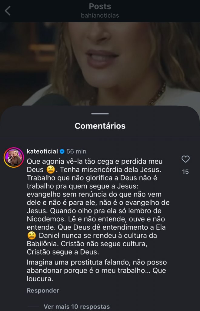 “Que agonia vê-la tão cega e perdida meu Deus. Tenha misericórdia dela Jesus. Trabalho que não glorifica a Deus não é trabalho pra quem segue a Jesus: evangelho sem renúncia do que não vem dele e não é para ele, não é o evangelho de Jesus”, afirmou Katê. Na ocasião, Claudia Leitte afirmou em entrevista ao Flow Podcast que tratava toda situação como um trabalho. Para a artista, cantar axé não significa se afastar de Deus, mas sim exercer a sua profissão, assim como outros artistas que também são convertidos ao evangelho, como Xanddy e Carla Perez.